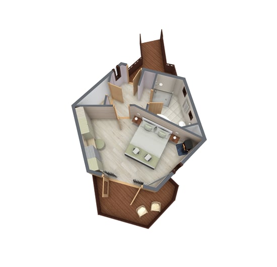Treehouse bedroom across a rope bridge